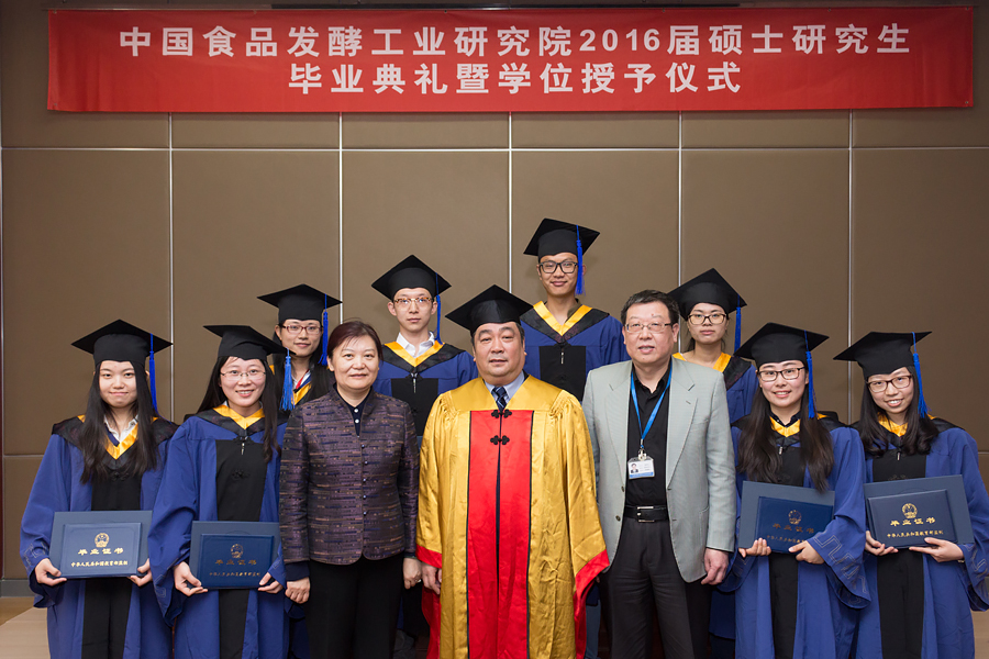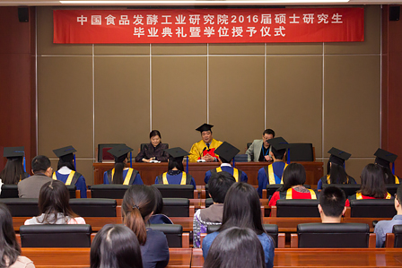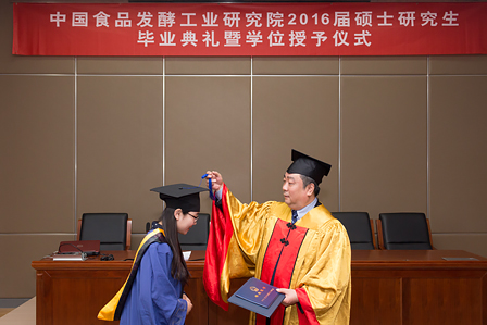 王潔副書記宣讀了中國食品發酵工業研究院學位評定委員會關于授予韓麗麗等八位同學工學碩士學位的決定,在莊嚴而熱烈的氣氛中,蔡木易院長為碩士學位獲得者頒發畢業證書和學位證書,并為學子們“撥穗”。