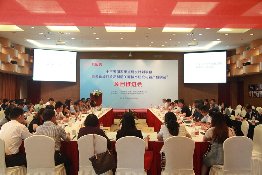 “十三五”國家重點研發計劃“營養功能性食品制造關鍵技術研究與新產品創制”項目2018年上半年度推進會于6月2日在浙江杭州成功召開。專項管理專業機構中國農村技術開發中心戴炳業副處長、丁紅雷副教授,項目協同專家中國農業大學胡小松教授、江南大學金征宇教授、中國疾病預防控制中心營養與食品安全所楊曉光研究員、中國環境科學研究院尚玉梅高級會計師出席會議并對項目實施情況進行了點評。項目牽頭單位中國食品發酵工業研究院有限公司,課題承擔單位國家食品安全風險評估中心、中國疾病預防控制中心營養與健康所、國家體育總局運動醫學研究所、東北農業大學,以及課題參與單位共25家單位80余人參加了本次會議。本次推進會由項目參與單位貝因美嬰童食品股份有限公司承辦。