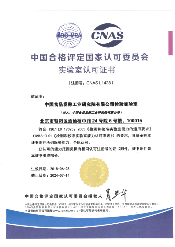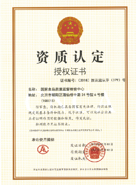 近日,食品院所屬國家食品質量安全檢測中心獲得由中國國家認證認可監督管理委員會(CNCA)頒發的第三張檢驗檢測機構(CMA)資質認定證書,至此食品院食品檢測中心已擁有檢驗檢測機構資質認定證書(CMA)、實驗室認可證書(CNAS)、國家中心資質認定授權證書(CAL)共5張證書。
