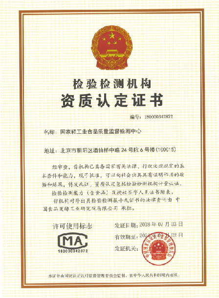 CMA資質認定證書的獲得,標志著食品院檢測中心已具備以法人單位名義向社會出具第三方公正數據和結果的能力,也標志著食品院檢測中心在完善自身食品檢測能力和資質、提升檢測服務工作質量和推進國家食品檢測領域業內轉型升級的路上前進了扎實的一步。