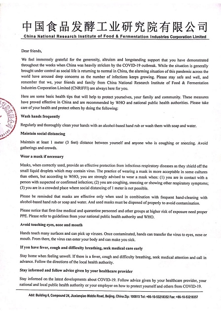 最后,食品院向全球奮戰在抗擊疫情一線的醫護人員、工作人員和志愿者們,所有為抗擊疫情給予援助的朋友們表示真誠的感謝。
