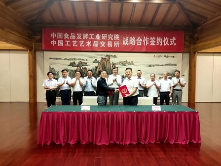 2020年8月18日下午,中國食品發酵工業研究院有限公司(以下簡稱“食品院”)與中國工藝藝術品交易所有限公司(以下簡稱“中國藝交所”)就食品類(醬香型白酒)的籌劃運營合作簽約儀式在新保利大廈隆重舉行。保利集團副總經理劉軍才,中輕集團黨委書記、董事長張萬順,工藝集團黨委書記、董事長李晶,保利集團行政管理中心副主任譚勝,中國工藝集團副總經理包額爾敦,食品院總經理董建輝,中國藝交所總經理于峰,食品院副總經理宋全厚等出席了簽約儀式,簽約儀式由工藝集團總經理助理、藝交所黨委書記戎志宏主持。