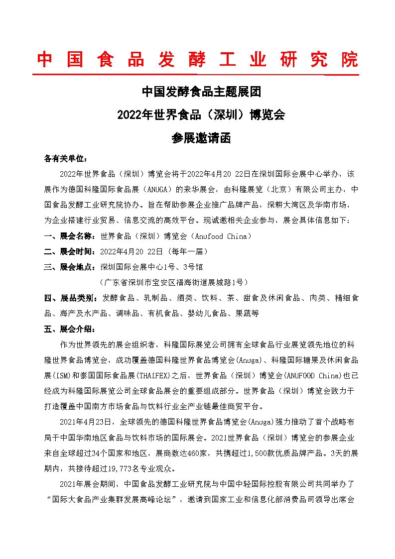 中國發(fā)酵食品主題展團2022年世界食品(深圳)博覽會參展邀請函