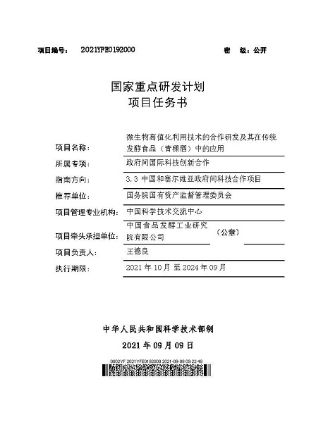 近日,國(guó)家科技部公布國(guó)家重點(diǎn)研發(fā)計(jì)劃-政府間科技創(chuàng)新合作項(xiàng)目立項(xiàng)結(jié)果,中國(guó)食品發(fā)酵工業(yè)研究院所屬國(guó)家酒類品質(zhì)與安全國(guó)際聯(lián)合研究中心牽頭申報(bào)的“微生物高值化利用技術(shù)的合作研發(fā)及其在傳統(tǒng)發(fā)酵食品中的應(yīng)用[項(xiàng)目編號(hào):2021YFE0192000]”項(xiàng)目成功獲批,該項(xiàng)目是聯(lián)合塞爾維亞貝爾格萊德大學(xué)、西藏自治區(qū)農(nóng)牧科學(xué)院共同申報(bào),項(xiàng)目負(fù)責(zé)人為國(guó)際聯(lián)合研究中心主任王德良教授。