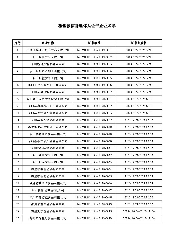 關于撤銷中港(福建)水產食品有限公司等61家食品企業誠信管理體系證書的聲明
