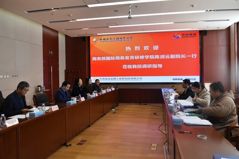 4月1日上午,商務部國際商務官員研修學院陳潤云副院長到訪中國食品發酵工業研究院調研援外培訓工作。援外培訓聯絡辦公室處長杜兆君、培訓干事王靖靖、項目管理二處經辦程潔隨訪,保利中輕總經理助理、中國食品院黨委書記、總經理肖丹,副總經理段盛林,總經理助理羅燕琴、高級顧問黃宇彤及國際合作與貿易發展部國際培訓中心相關人員陪同調研。