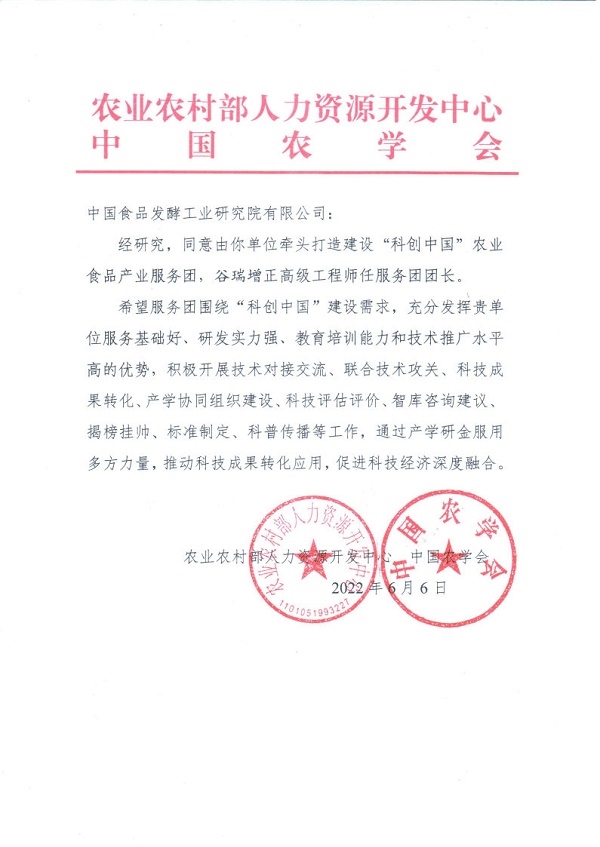 近日,農(nóng)業(yè)農(nóng)村部人力資源開發(fā)中心和中國農(nóng)學(xué)會聯(lián)合發(fā)函,批準由中國食品發(fā)酵工業(yè)研究院有限公司牽頭,聯(lián)合中國疾病預(yù)防控制中心營養(yǎng)與健康所、國家食品安全風(fēng)險評估中心、東北農(nóng)業(yè)大學(xué)、四川大學(xué)華西醫(yī)院以及江中藥業(yè)股份有限公司共同打造建設(shè)“科創(chuàng)中國”農(nóng)業(yè)食品產(chǎn)業(yè)服務(wù)團,由中國食品院副總經(jīng)理谷瑞增任服務(wù)團團長。