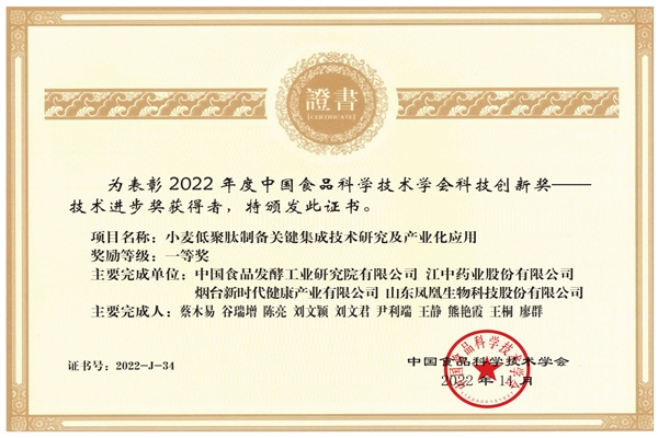 在近期中國食品科學技術學會公布的2022年度科技創(chuàng)新獎評審結果中,中國食品發(fā)酵工業(yè)研究院有限公司完成的《小麥低聚肽制備關鍵集成技術研究與產(chǎn)業(yè)化應用》項目榮獲技術進步獎一等獎。