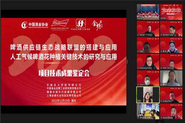 2022年12月19日,由百威亞太控股有限公司和中國食品發(fā)酵工業(yè)研究院有限公司合作完成的“啤酒供應鏈生態(tài)戰(zhàn)略聯(lián)盟的創(chuàng)建與應用”“人工氣候啤酒花種植關(guān)鍵技術(shù)的研究與應用”兩個項目通過了由中國酒業(yè)協(xié)會組織的科技成果鑒定,鑒定委員會一致認為這兩個項目成果均為國內(nèi)首創(chuàng),技術(shù)水平達到國際領(lǐng)先水平。