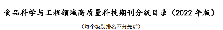 為貫徹落實習近平總書記關于“辦好一流學術期刊”的重要指示精神,推動科技期刊邁向世界一流水平,2022年8月,中國食品科技學會按照中國科協、中宣部、教育部、科技部聯合印發的《關于深化改革培育世界一流科技期刊的意見》部署,啟動《食品科學與工程領域高質量科技期刊分級目錄》的認定工作。經過包括7位院士在內的全國207位專家經嚴格審定,最終認定17個國家和地區的155種期刊入選《目錄》。入選期刊分為T1、T2和T3三個級別,T1類表示已經接近或具備國際頂級水平的期刊,T2類是指具有較高水平的國際知名期刊,T3類指為學術界所認可的國內外優質期刊。其中T1類不超過入選《分級目錄》期刊總量的20%。其中最高等級T1類期刊30種,含24種英文期刊和6種中文期刊,《食品與發酵工業》成為唯一一份成功入選的由中央企業主辦的食品領域期刊。