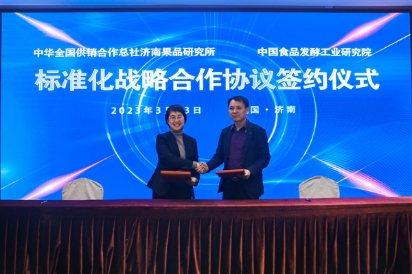近日,中國食品發酵工業研究院有限公司與濟南果品研究所在濟南舉行標準化戰略合作簽約儀式。中國食品院黨委委員、副總經理郭新光、標準與數字化研發部主任助理王曉龍一行,濟南果品研究所黨委委員、副所長宋燁,黨委委員、加工技術研究中心主任趙巖等出席簽約儀式并進行座談交流。