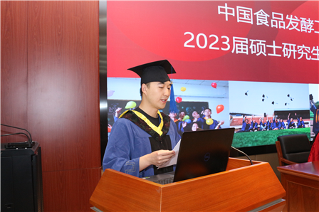 畢業(yè)生張卓然同學代表全體畢業(yè)生向食品院、向辛勤培育學子的老師表達了衷心的感謝并致以崇高的敬意,表示在食品院里度過了三年美好的時光,在各位老師的言傳身教下,由科研的“新鮮?”,成長為科研的“實踐者”,最終成長為一名合格的碩?研究生;畢業(yè)后將帶著對母校的責任感走向社會和工作崗位,全體同學將努力拼搏,力爭佳績,以實際行動回報中國食品院的培養(yǎng)。