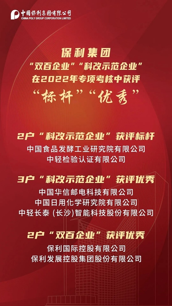在“科改示范企業(yè)”年度專項考核中,中國食品發(fā)酵工業(yè)研究院有限公司、中輕檢驗認(rèn)證有限公司被評為“標(biāo)桿”企業(yè),中國華信郵電科技有限公司、中國日用化學(xué)研究院有限公司、中輕長泰 (長沙)智能科技股份有限公司被評為“優(yōu)秀”企業(yè)。在“雙百行動”年度專項考核中,保利國際控股有限公司、保利發(fā)展控股集團股份有限公司被評為“優(yōu)秀”企業(yè)。
