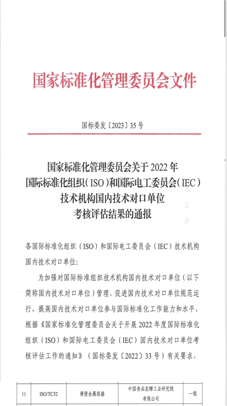 近日,由中國食品發酵工業研究院有限公司承擔的“國際標準化組織薄壁金屬容器技術委員會(ISO/TC52)國內技術對口單位”順利通過國家標準化管理委員會關于2022年國際標準化組織(ISO)和國際電工委員會(IEC)技術機構國內技術對口單位的考核評估并榮獲一級國內技術對口單位。