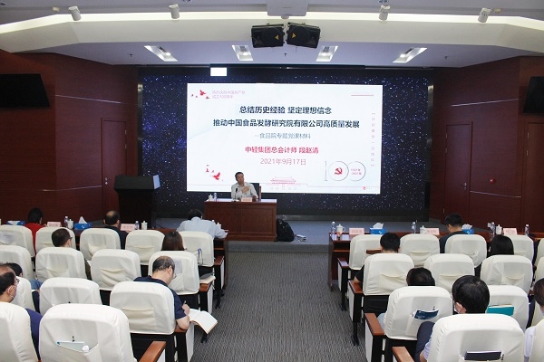 2021年9月17日,中國食品發酵研究院有限公司組織召開專題黨課報告會,由保利中輕總會計師段趙清以“總結歷史經驗,堅定理想信念,推動中國食品發酵研究院有限公司高質量發展”為題,為食品院黨員干部講授專題黨課。報告會由食品院黨委書記董偉紅主持,食品院黨政領導班子成員、中心主任以上干部(含中食檢),黨支部書記、委員,團委書記、委員以及中食公司黨政領導班子成員共計70余人參加。