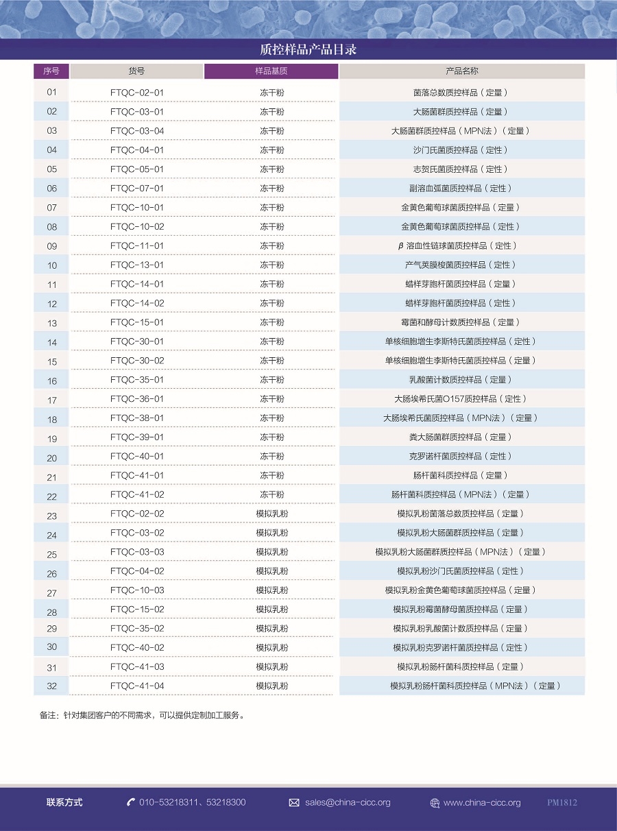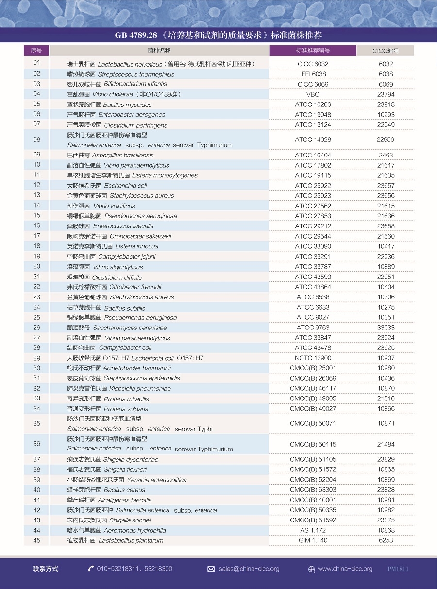 質(zhì)控菌種:庫藏質(zhì)控菌株1000余株,廣泛應(yīng)用于食品、化妝品、環(huán)保、消毒和醫(yī)療機(jī)械等領(lǐng)域的微生物學(xué)檢驗、質(zhì)量控制和生產(chǎn)過程控制。